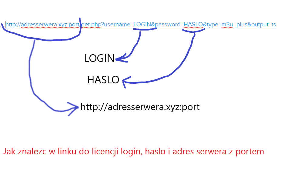 Oto przykład http://adresserwera.xyz:port/get.php?username=LOGIN&password=HASLO&type=m3u_plus&output=ts